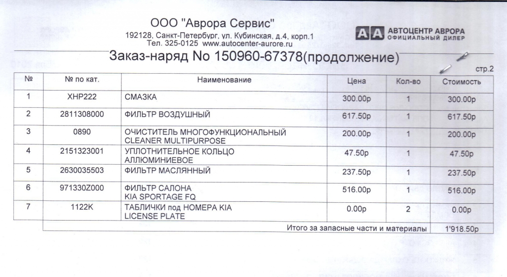 ХРюндель писал(а):Сделали сегодня ТО-1. Автоцентр Аврора на Кубинской (Питер). Работы - 4 125, материалы - 1 918 ( фильтр воздушный 600р.) и масло MOBIL 5W40 4 литра - 1 980 руб. Плюс провели по требованию КИА гарантийную проверку выключателя ЗХ и датчика скорости (новое распоряжение "сверху"). По времени около четырех часов. Кому интересно - могу скан скинуть работ и материалов.