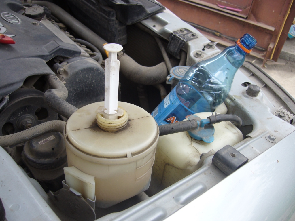 Способ замены данной жидкости хорошо описан в ветке маджентиса уважаемым LEOPOLD, за что ему огромное спасибо, как и форуму. Взято отсюда- http://www.forum.kia-club.ru/kb.php?a=434 Итак, приступаем. Сначала поддомкратил перед, поставив под машину деревянные бруски, дабы облегчить процедуру вращения руля. Взял медицинский шприц, полторалитровую пластиковую бутыль и откачал, сколько смог из бачка жидкость. Отсоединил клемму на бензонасосе(почему-то мне так проще). Бачок крепится просто, без болтов и гаек, сверху отгибаем металлический язычок и тянем бачок вверх. Хомуты со шлангов длинногубцами стягиваем, шланги крутим, для облегчения снятия бачка. Место под бачком и ремень допов накрываем полимерным мешком, чтобы не налить случайно масла. Снимаем шланги с бачка и стараемся поднять их вверх, т.к. если один шланг будет ниже, то жидкость будет капать, может образоваться воздушная пробка. Бачок. Избавляемся от остатков жидкости и, если внутри чисто, как было у меня, то тонкий выход глушим подходящим шлангом с болтом, или как у меня получилось. Если бачок грязный внутри – промыть и высушить. Надеваем бачок на толстый шланг(к насосу), тонкий опускаем в бутыль, привязав её в моторном отсеке. Наливаем свежую жидкость в бачок и прокачиваем. Я прокачивал вдвоем с супругой. Она крутила руль и включала стартер. Спасибо ей отдельное. Я доливал жидкость и следил за уровнем. За два захода(поворота руля туда и обратно) потекла чистая жидкость. У меня ушло 1,5литра. Обратку ставим на место, собираем всё в обратной последовательности. Вытираем шланги и везде, где накапали ветошью, ставим клемму бензонасоса, запускаем двигатель, крутим руль от упора до упора несколько раз и наслаждаемся проделанной работой. Данная статья не в коей мере не является аксиомой, каждый сам решает как и где делать это, думаю форумчанам пригодится. Спасибо. Эта статья последний раз отредактировна Стражник 18 май 2014, 22:02